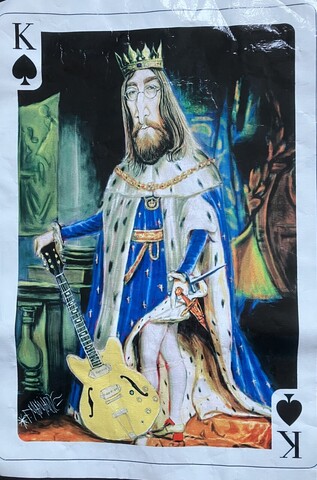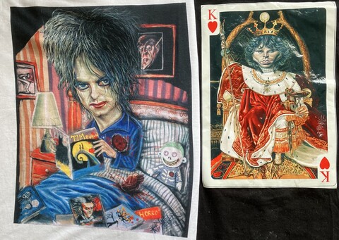 Last week's post about muralist Jorge Manjarrez went over so well on social media, for the holidays I'm posting another photo of Jorge's T-shirts. The two T-shirts seen here, with Robert Smith of The Cure printed directly on the shirt, and Jim Morrison as the King of Hearts printed on plastic and fused to the shirt, are only two examples of the wide variety of work Jorge does. He's best known for painting murals on Mexico City's subway stations, but also does illustrations for major Mexican newspapers and magazines, and has a line of playing cards illustrated with portraits of 54 (two jokers) different musicians and bands.
