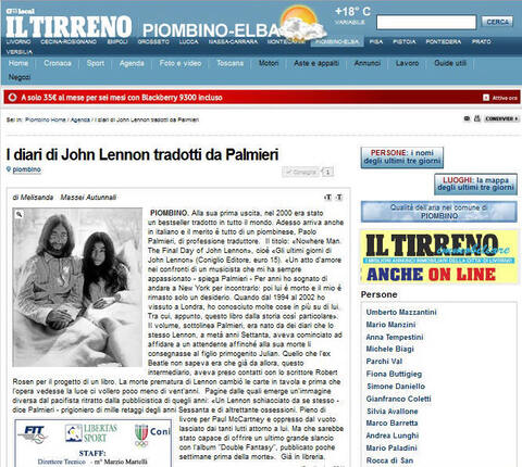 As Yoko Ono would be inclined to point out, yesterday, on the 18th day of the 9th month, the first article about the impending publication of Nowhere Man: Gli ultimi giorni di John Lennon (Coniglio) appeared in the Italian press. And what's extraordinary about this story, that ran in Il Tirreno, is that the book's translator (and my Italian Avatar), Paolo Palmieri, is mentioned in the headline, which roughly translates as "John Lennon's Diaries Translated by Palmieri."