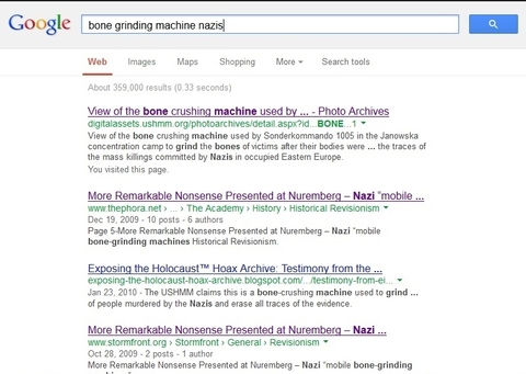 In the Adolf Eichmann chapter of Bobby in Naziland, the novel to which I'm currently applying some finishing touches, one of the things the Mistress of Syntax flagged was my reference to a bone-grinding machine used in death camps. She wanted to know if the machine had been built specifically for use in the camps. This was a good question, I thought, and turned to Google for an answer. The search terms I put in, as shown in the graphic, were: bone grinding machine Nazis. I was shocked and dismayed to see that the first three results were Holocaust denial sites. (In a search two days later, the denial sites placed two and four, and the order continues to change.)